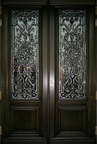 Входная металлическая дверь с порошковым покрытием стеклом и ковкой в частный дом №27